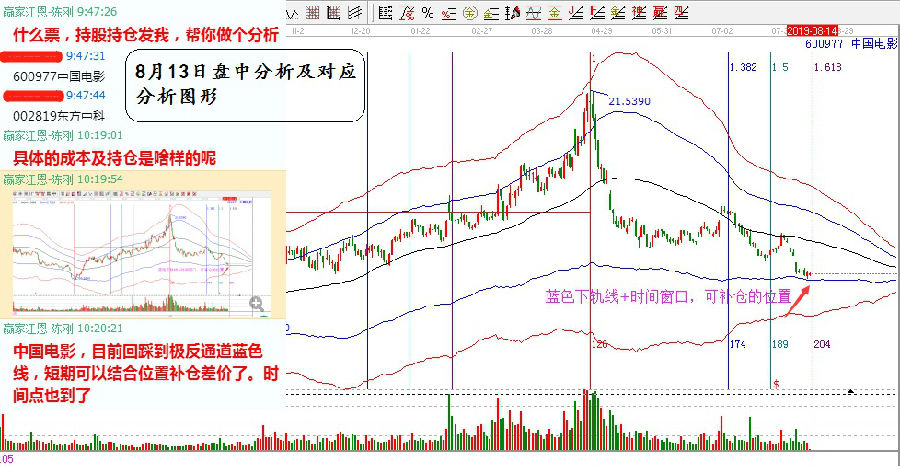 中國電影第一次分析的時間是在8月13日,由于是被套的股票,根據工具結果得出此位置超跌買點。從下圖中可以看到,當時股價是處于極反通道藍色下軌線附近,這是超跌類買點的必要條件,同時,通過時間分析,發現股價處于黃金時間周期線0.618分割位,因此預判此位置可能會發生趨勢的轉折,即時間窗口+價格支撐=股價反轉向上。