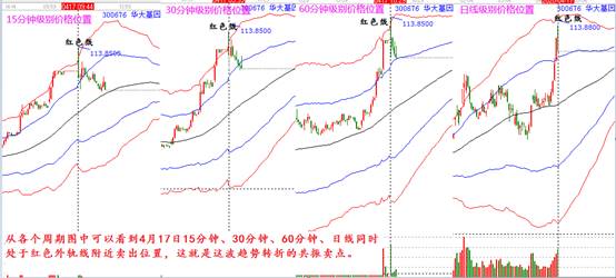 確定了買點,那么賣點在哪里呢?同樣的,按照極反通道的操作規則,一線站穩,看高一線。當股價的15分鐘、30分鐘、60分鐘、日線等周期都處于藍色線,或者紅色外軌線這類高概率的賣出點時,就意味著各個周期都處于賣出位置,這就是一個周期共振的賣點。我們再看下華大基因4月17日各個周期所處的位置。