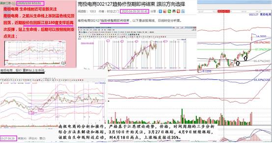 南極電商(002127):3月10日開始關注,3月27日跟蹤,4月9日跟蹤,該股自生命線附近啟動,到4月18日高點,上漲幅度35%。下圖是跟蹤記錄和具體的分析。