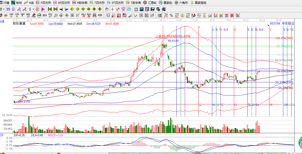 接下來該股如何操作跟進,大家可以看下華友鈷業的最新分析圖。6月16日時間窗當天和價格共振選擇往上,目前突破180度位置,逼近藍色上軌線那里 。目前藍色上軌線壓力價格是40.3元那里,屆時需要關注壓力的突破情況,下一個時間窗在3倍時間窗7月2日。