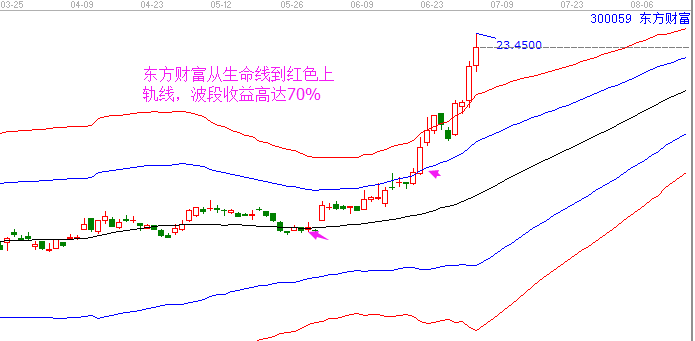 2、東方財富,從生命線到紅色超強勢外軌線,波段收益高達70%