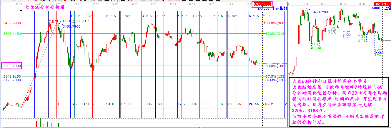 大盤繼續震蕩 日線神奇數字7的規律與60分鐘時間軌跡圖分析,明日29號是兩個周期指向的時間共振點 時間的共振 有望迎來方向選擇。日內空間繼續跟蹤第一支撐3205、3188點。