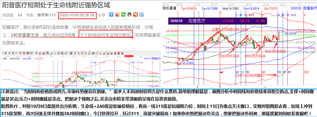 陽普醫療,對照10月9日盤前選出分析圖,生命線+240度是低吸價格位,看高一線315度是短期阻力位,時間上15日為重點關注窗口,實則對照圖形去看,短線上沖到315度受阻,再次回落支撐并疊加382時間窗口,今日快速拉升,躍過315,直接突破前高!
