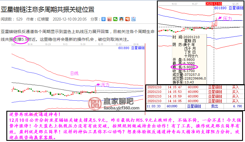 12月10日公開分析亞星錨鏈關鍵支撐是5.9元,昨日最低打到5.9元止跌回升,不偏不倚,一分不差!今天強勢沖漲停!今天藍色上軌線壓力沒有有效突破,按照規則做減持賣出動作!有了工具,操作就是那么簡單有效,盈利就是那么簡單!