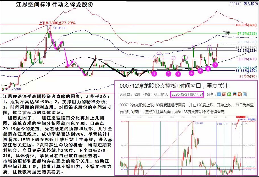 <江恩時間窗+生命線>選股應用之洛陽鉬業生命線是強勢股票的啟動點,買股買在生命線,穩健又強勢;時間是決定市場走勢的關鍵因子。當江恩時間窗遇到生命線,視為極佳進場信號。對照洛陽牧業分析圖,先看粉色1-2-3,江恩時間窗口加生命線給出進場信號后,均如期展開一波上攻;再看黑色1、2,上攻到紅線遇阻后疊加時間窗展開快速回調。粉1到黑1,一波上漲;粉2到黑2,一波上漲;粉3呢?繼續踩著生命線展開上攻,逼近第一目標藍線,問:黑3在哪呢?洛陽鉬業12月15日按照時價法則選出、2月1日提前選出,2月8日強調時間窗抵達生命線,連續4日上攻今日封板,漲幅達25%!