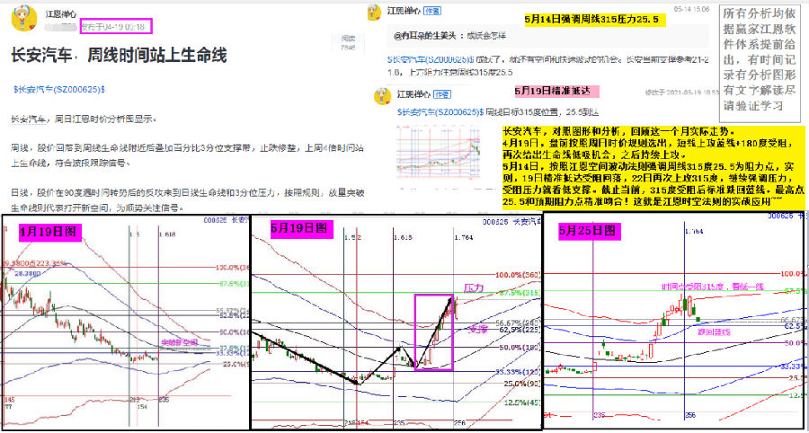 5月14日,按照江恩空間波動法則強(qiáng)調(diào)周線315度25.5為阻力點(diǎn),實(shí)則,19日精準(zhǔn)抵達(dá)受阻回落,22日再次上攻至315度,繼續(xù)強(qiáng)調(diào)壓力,受阻壓力就看低支撐。截至當(dāng)前,315度受阻后標(biāo)準(zhǔn)跌回藍(lán)線。最高點(diǎn)25.5和預(yù)期阻力點(diǎn)精準(zhǔn)吻合!這就是江恩時(shí)空法則的實(shí)戰(zhàn)應(yīng)用。