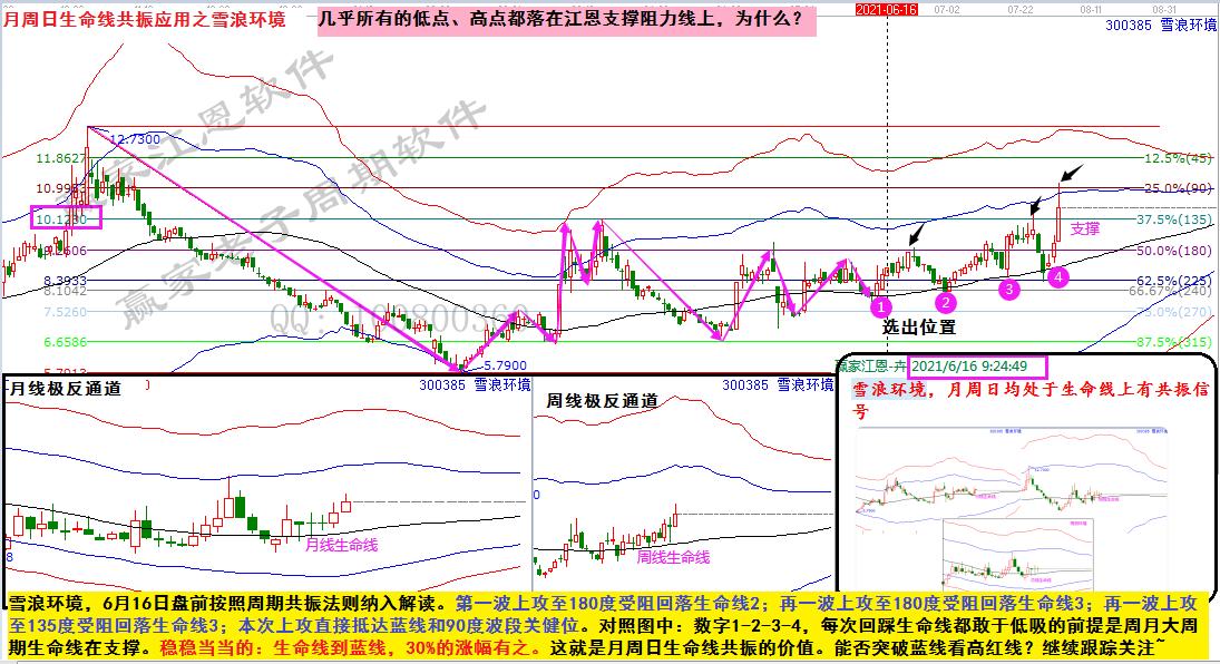 雪浪環(huán)境,6月16日盤(pán)前按照周期共振法則納入解讀。第一波上攻至180度受阻回落生命線2;再一波上攻至180度受阻回落生命線3;再一波上攻至135度受阻回落生命線3;本次上攻直接抵達(dá)藍(lán)線和90度波段關(guān)健位。對(duì)照?qǐng)D中:數(shù)字1-2-3-4,每次回踩生命線都敢于低吸的前提是周月大周期生命線在支撐。穩(wěn)穩(wěn)當(dāng)當(dāng)?shù)模荷€到藍(lán)線,30%的漲幅有之。這就是月周日生命線共振的價(jià)值。能否突破藍(lán)線看高紅線?繼續(xù)跟蹤關(guān)注~