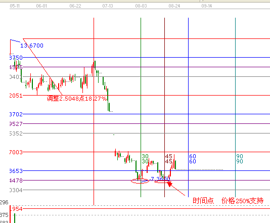 一:時間:(自定義周天江恩時間循環(huán)線)8月16號是江恩時間循環(huán)線的第45天的時間變盤點,(使用,只需取一個點就ok了,取點2012年7月3日為起點)