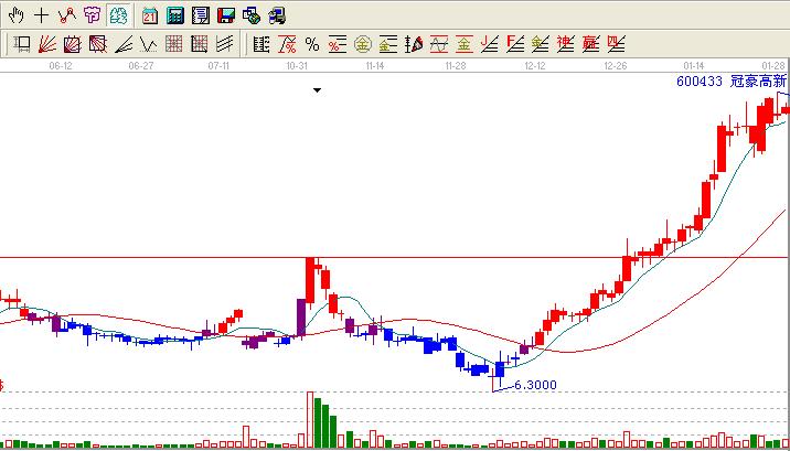 反觀歷史我們會(huì)發(fā)現(xiàn)蛛絲馬跡:600433在2012-11-01日放量后9.00一路跌倒6.30位置然后開(kāi)始了10連陽(yáng)。這個(gè)也有人叫做十全十美,一般會(huì)走出一波行情,那么600433在走出十全十美之后一直是馬不停蹄緩緩上行,在其2012-12-27日很小的量過(guò)了9.00附近的高點(diǎn)創(chuàng)出了歷史新高,這個(gè)位置沒(méi)有停留多久就再一次新高基本是3天5天一個(gè)新高也不理會(huì)大盤,就那樣一直橫行無(wú)阻的新高著。很多人都發(fā)現(xiàn)了這個(gè)股票不錯(cuò),但是都是啃一口就走掉了,就這樣一直看著他新高。江恩的話在這個(gè)案例中再一次發(fā)揮的淋漓盡致。也充分的說(shuō)明了江恩理論在其實(shí)戰(zhàn)中的一個(gè)地位,就看你是如何理會(huì)江恩理論了。