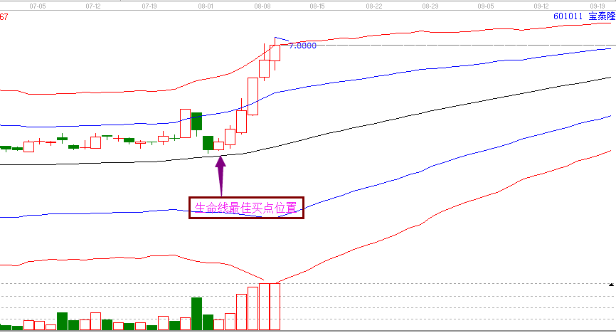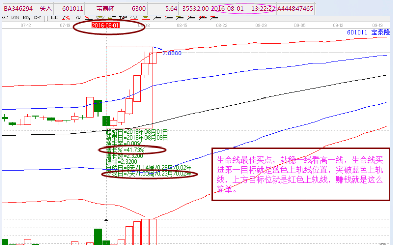 2.圖形解析:在極反通道操作規(guī)則中,生命線是強(qiáng)勢和弱勢的區(qū)分線。處于極反通道生命線上,則為強(qiáng)勢;反之,處于生命線下則為弱勢。而在強(qiáng)勢區(qū)域的個(gè)股,買點(diǎn)位置在每一條線的支撐位附近。即生命線支撐位的位置以及藍(lán)色上軌線支撐的位置。寶泰隆在8月1日回踩極反通道生命線位置,形成了生命線最佳的買點(diǎn)位置。因此在8月1日回踩生命線的時(shí)候開始操作。