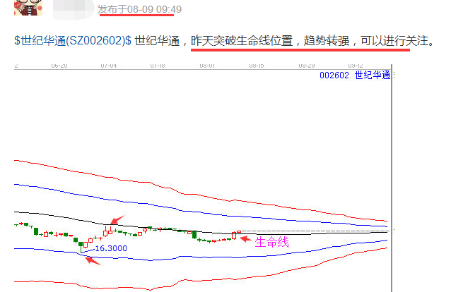 2.在極反通道操作規則中,生命線將個股分為強勢和弱勢兩個區域,當個股處于極反通道生命線上,則為強勢,當個股處于極反通道生命線下,則個股處于弱勢區域。強勢區域個股操作機會多,股性活躍,盈利空間大。而生命線下個股則走勢偏弱,股性也慢,操作風險偏大。因為極反通道就是一個個股能否操作的判斷性工具。也因為簡單直觀,所以能幫使用者更快速的判斷市場,判斷個股,并得出結論。極反通道的五條線均可以是個股的阻力位支撐位,站穩為支撐,破位為阻力。按照江恩的講解,買在支撐位,賣在阻力位,因此,當個股突破站穩生命線的時候,趨勢剛剛轉變,可以看作新的行情的啟動點,生命線就是最佳的買點位置,所以在8月9日個股再次突破并回踩生命線的時候,就形成了新的機會,開始操作。