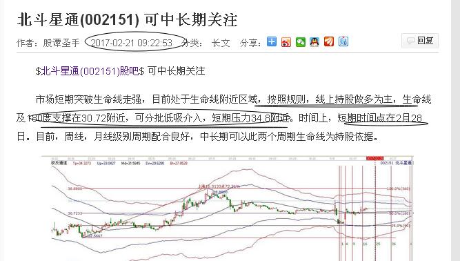 而市場后期的走勢完全印證了前期的分析,選出后,股價回落生命線,并在時間點2月28日啟動上升,快速到達藍色線,結合分析中的價格,從30.72到34.8左右,幾乎是可以完全把控,在操作的過程中,這波利潤很容易拿到10%左右的獲利空間。在實盤操作中,也曾及時的結合工具做出提示。
