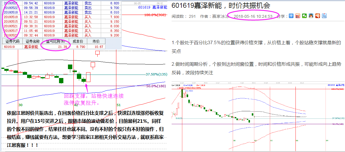 嘉澤新能,5月15號依據江恩時價共振選出,用戶同步參與,贏家聊吧16號發布,參與之后回落江恩價格百分比50%重要支撐位,止跌并快速以連續漲停板收復拉升。用戶在15號買進之后,跟隨市場的波動在止跌企穩之后聯系做差價降低成本,目前盈利21%。
