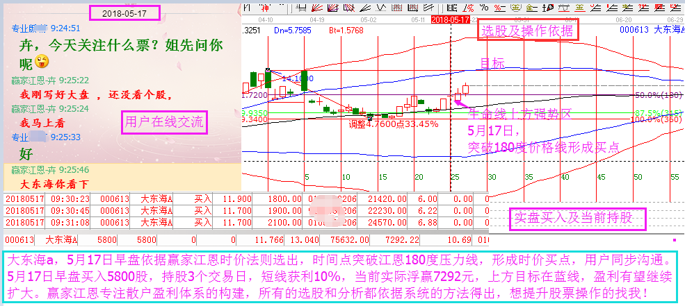 大東海a,5月17日依據贏家江恩時價法則選出,時間點突破江恩180度壓力線,形成買點。用戶按照規則同步操作,今天創出近期新高點,漲幅超過15%。