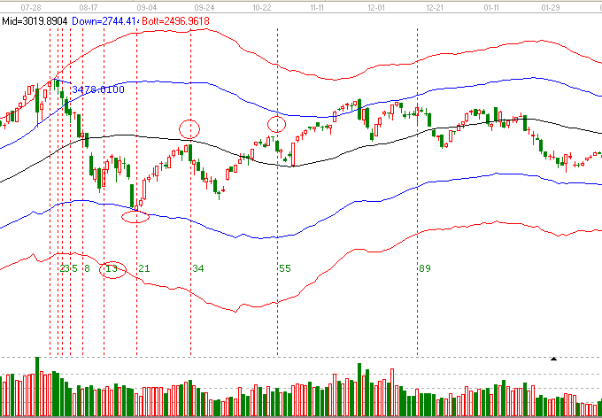 以上證指數為例,對此工具的畫法做一個演示。首先我們要用鼠標選中費氏時間循環線這個工具的圖標,點擊左鍵,我們在選點的過程中可以根據個人的經驗來選擇它的點位,高點或者是低點,那么我下面就選擇一下這個一個小波段的高點,2009年8月4號這一天點位3478點),這個工具的操作也是很簡單的,點擊鼠標左鍵,在你選擇起點的這個位置即可,我們可以看一下,費氏時間循環線,它是以費波納奇神奇數字排開的,1,2,3,5,8、13、21,一只向后延伸。那么以前我們有講過,如果幾個同等重要的時間點位形成共振的情況下,下一條所提示的時間點位就為重要的時間之窗,應該給予關注。