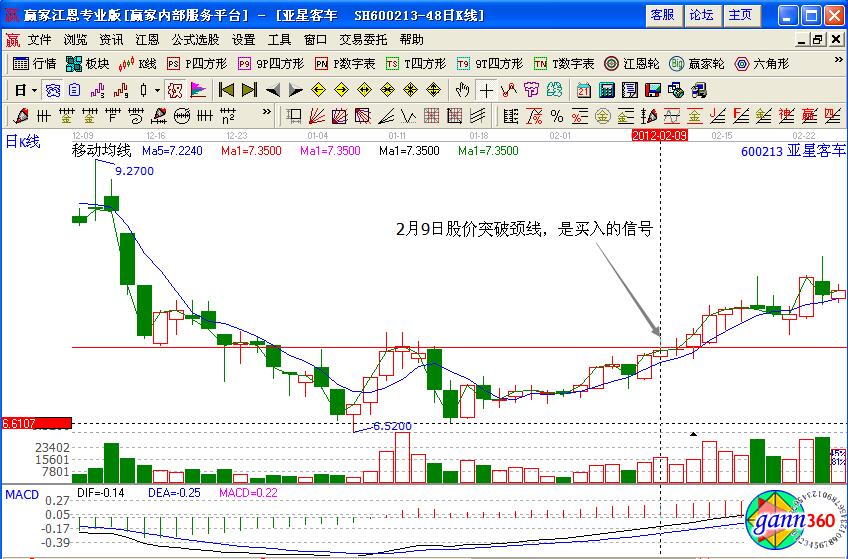 具體的案例如圖亞星客車(600213)的股價(jià)在經(jīng)過一波大幅下跌趨勢之后,在低位出現(xiàn)逐漸的企穩(wěn),并形成了雙底的形態(tài),這個(gè)時(shí)候觀察買點(diǎn)可以發(fā)現(xiàn)在2月9日的時(shí)候均線向上突破了頸線,出現(xiàn)了該股的買點(diǎn),投資者可以介入。
