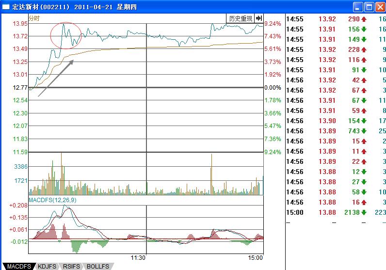 如圖宏達新材(002211)在2011年4月份的股價走勢變化,股價一直處于明顯的上漲趨勢中,而且在上漲的過程中出現的陽線多于陰線的走勢,4月8日的時候股價開始了一根大陽線的拉升走勢,之后出現的回調形成了“彩虹橋”的基本走勢形態,對應的量能配合比較合理,形成的是量升價漲,價跌量縮的基本走勢形態。