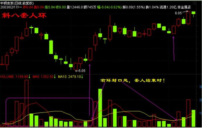 指的是當投資品種出現異動的天量之后,斜8套人環也就會隨之出現,是均量線形成的倒8字形態的走勢,具有的實戰含義有3點內容: