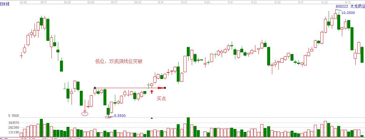 底部經典形態是雙底形態,在基本面配合的情況下,一旦突破雙底頸線位其漲幅往往很樂觀。這種圖形的股票往往是兩個極端的票,要么是市盈率比較高的低谷績優股,要么是st重組股,他們再底部的時候往往先是連續的小陽線,然后逐步爆出大陽線,如下面運用贏家江恩軟件所做的圖形。