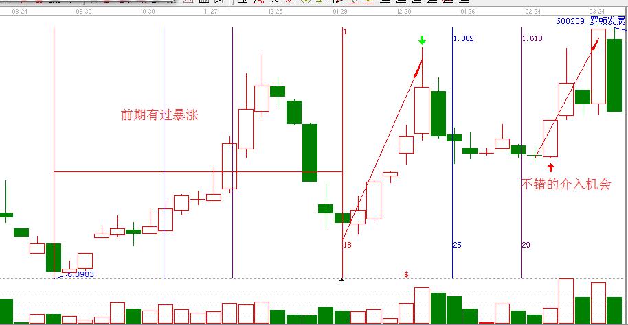 每個階段都有一些活躍的個股,這表明這些股票的主力是活的,他們對于市場的反應比那些已經不看盤的主力快速而猛烈。同時在前一階段爆發過比較大題材的個股值得重點關注。在技術上,結合時間周期,可以做他的第二波,如下面羅頓發展走勢圖。