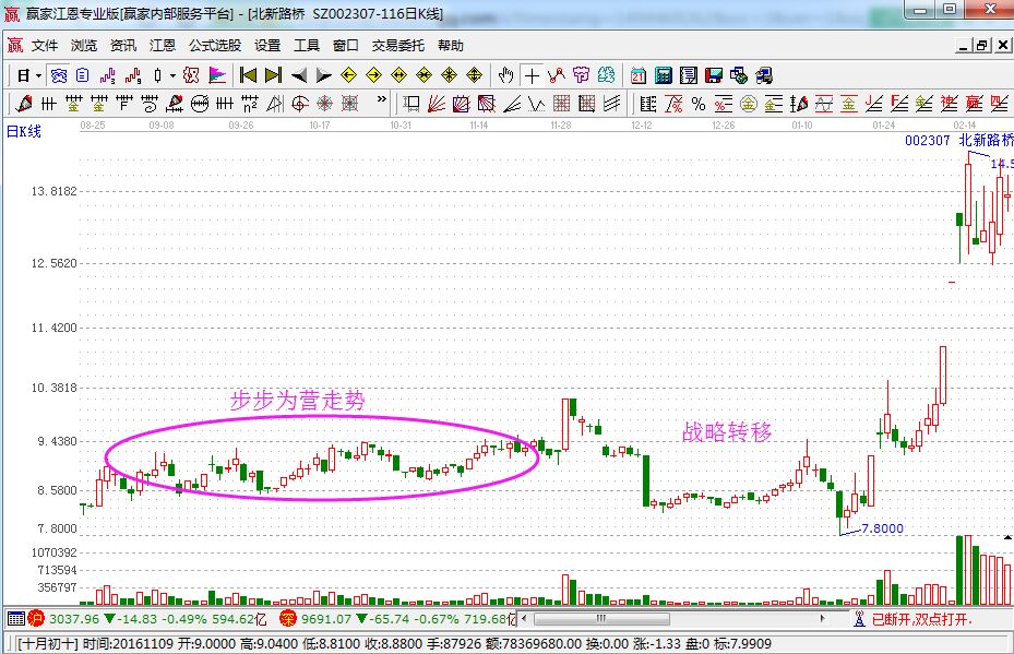 擺動交易的底部至頂部的上行段為“步步為營”階段,該階段的日K線組合特點為上漲有量,下跌縮量,股價穩步上行。如下面就是運用炒股軟件所截取的北新路橋走勢圖。