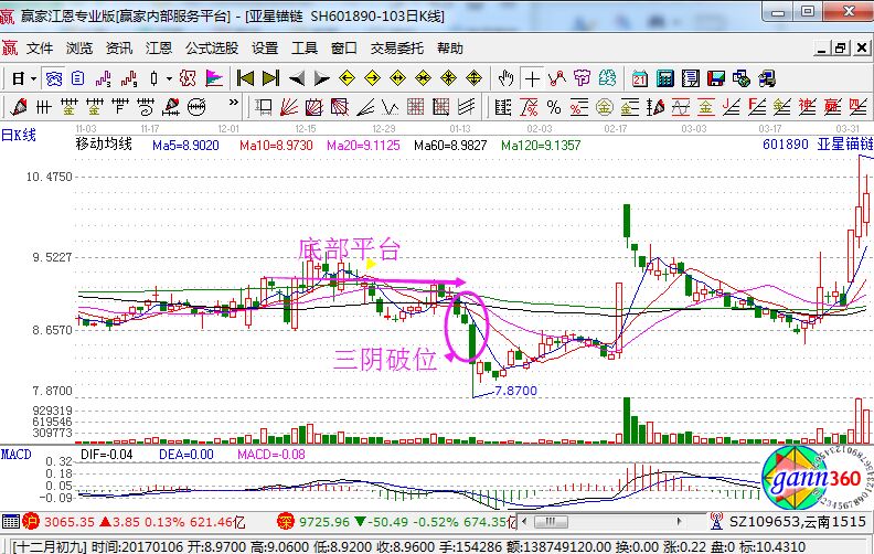 底部三陰破位就是:股價前期構筑底部平臺,股價擊穿前期底部平臺,股價受20日、60日均線壓制,5、10、20、60日均線空頭排列,5日均線下穿10日均線形成死叉。如下面運用炒股軟件所截取的亞星錨鏈走勢圖。