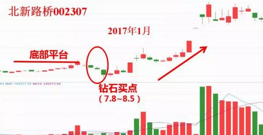 圖中的亞星錨鏈在8元附近出現底部三陰破位的模型,跌破主力的成本區間,形成中期的鉆石買點。當前期軍工概念炒作時,它的表現異常突出,其中不乏主力資金參與其中的原因,也正因為此,圖中提示的買點,成為階段性的絕對低價。接下來我們看北新路橋走勢圖。