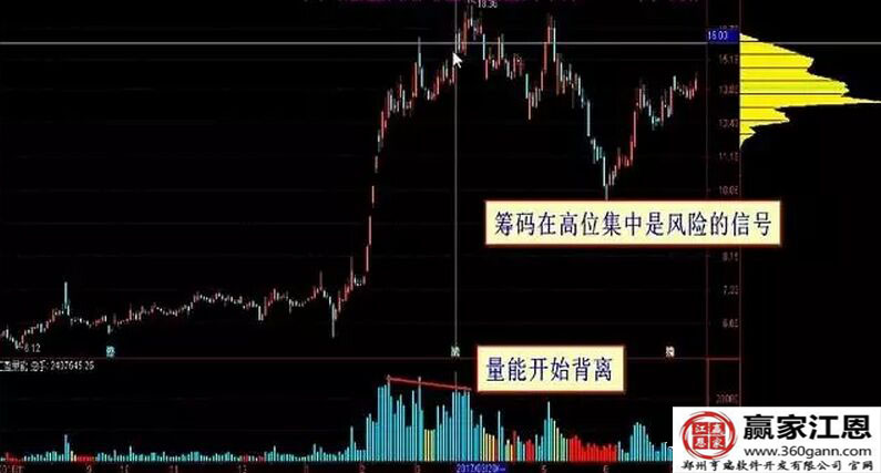 量能放大也就意味著換手放大,也就將進入到下一個過程,就是高位集中,高位集中我說了,不代表一定會跌,在高位由于一只股票已經充分的活躍起來,它會形成一只短線股,每天上下波動10幾個點,很多的短線客就非常喜歡在高位玩這些股票,玩的好了,一個禮拜賺10個點8個點不困難,但是不是所有的散戶都具備這樣的能力的。所以籌碼在高位集中是風險的信號。