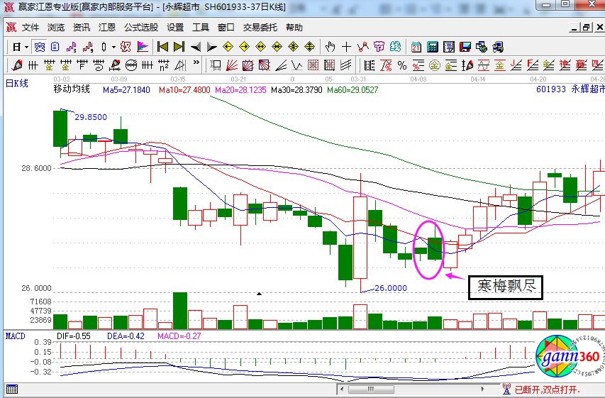 上圖是永輝超市在2011年4月份的日K線走勢圖,該股從階段性的高點29.85的價格開始進行一路下跌,而且在這期間還出現了跳空下跌,但是在4月份11日的時候就走出了寒梅飄盡形態,最后一根K線將墻面的兩根陰線全部吞沒,顯然是階段性的底部反攻形態,同時對于的macd指標形成了金叉,顯然是一個買入信號,所以此時投資者只需要觀察次日的走勢,如果是出現在低開的陽線走勢,那么就可以大膽的介入了,這樣就可以等后市的操作從而進行獲利。