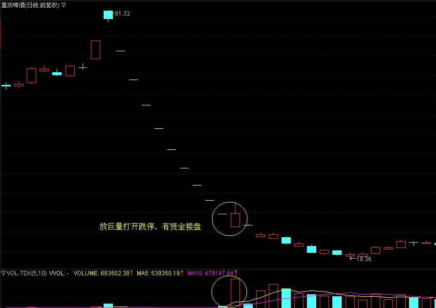 對(duì)于一字跌停板來說,全天成交量越小,換手率月底,就說明了空方的拋壓越多,多方的承接盤也就越少了,所以相應(yīng)的后續(xù)下跌的力量就會(huì)更強(qiáng),跌幅更大。相反的,如果成交量越大,換手率就越高,那就說明了多方承接盤開始大量介入,相應(yīng)的股價(jià)就會(huì)立即止跌企穩(wěn)。如下面的重慶啤酒走勢(shì)圖。