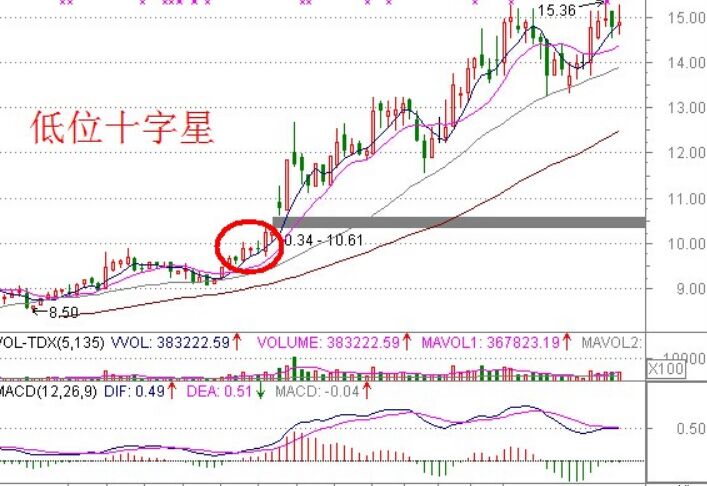 技巧五、低價區(qū)域出現(xiàn)十字星
