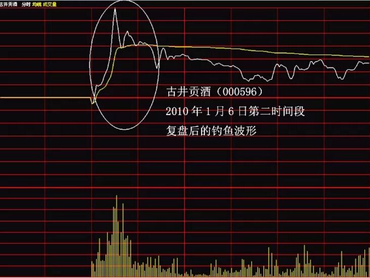 股票釣魚波是怎么樣的?它其實(shí)指的就是股價(jià)在盤中拉升過程中弧線幾乎垂直式跳水下跌的波動(dòng)特征,因這一波動(dòng)特征而形成的即時(shí)波形就是“釣魚波”。由于該形態(tài)出現(xiàn)前,股價(jià)呈現(xiàn)長(zhǎng)波攻擊性拉高特征,當(dāng)股價(jià)漲至一定高位時(shí),盤中突然跳水,其形態(tài)就像釣魚姿態(tài),故此得名。如下面的古井貢酒的分時(shí)走勢(shì)圖。