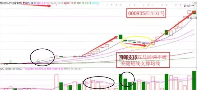 3、 前期拉升過程必須要有成交量的不斷放大,回踩過程中,成交量極度縮量,表示資金沒有退場,準備第二波的拉升。