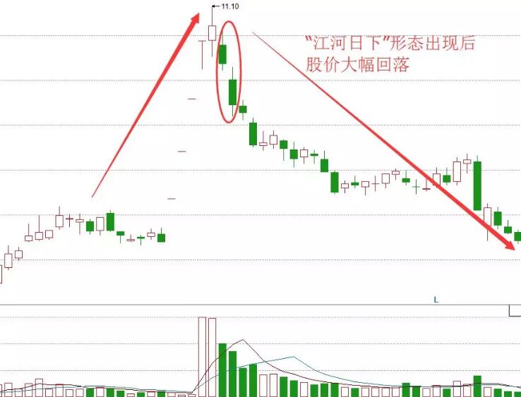 價格處于大幅上漲或者階段性反彈的高位區域;第一個交易日,分時圖上出現低開低走,形成一根中陰線或者大陰線。低開低走后的第二個交易日,股價直接放量低開。后市呈現立即反彈,但是價格中心始終低于第一根低開低走的陰線,那么就說明了江河日下形態已經確立。