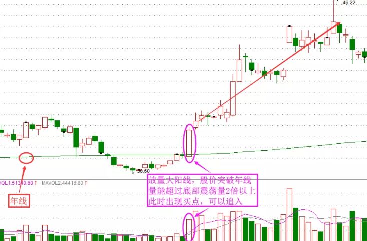 從上面青島啤酒的K線圖中,我們可以看到,這只股票在前期震蕩調(diào)整,然后來到了年線附近,并且在年線附近進行逐步的走穩(wěn),隨后,一根放量大陽線,將股價推升至年線上方,此時的量能是前期底部量能的2倍以上,符合大牛擎天形態(tài),在這個時候投資者就可以進行買入了,因為后期是會有充足的獲利空間。