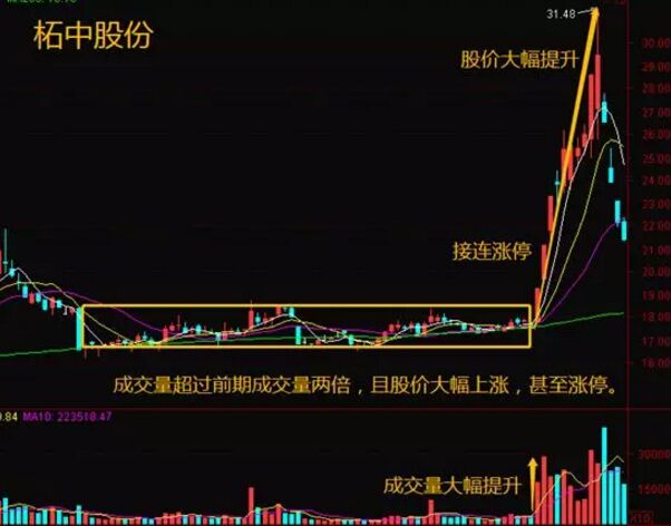 股票在經過一段時間之后,K線走出多根小陰線和小陽線,每一根K線的漲跌幅度都不大,且位置基本水平,組成了“一”字平臺。突然有一天,股價放量上漲,這天的成交量超過前期成交量兩倍,且股價大幅上漲,甚至漲停。平臺起飛形態說明多方力量經過一段時間積累后,集中爆發,這是股價將持續上漲的信號。如下面的柘中股份的走勢圖。