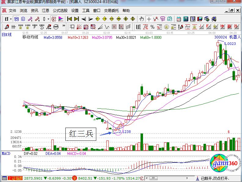1、 連續三根陽線。這三根K線呈現逐漸上漲的趨勢,其中每日的收盤價要高于前一日的收盤價,同時,每日的收盤價要接近最高點。