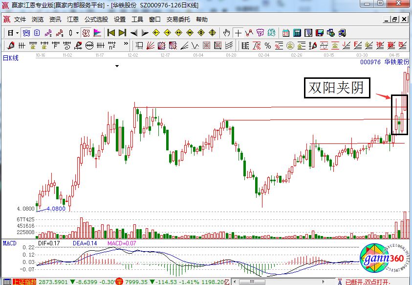 雙陽夾陰形態(tài)在使用過程中,有一句口訣,它就是:雙陽夾陰漲勢(shì)多,騎墻過線看多頭;后量超前真信號(hào),青云白鶴樂悠悠。具體來說怎么樣應(yīng)用?下面我們打開股票軟件來看000976的走勢(shì)圖。