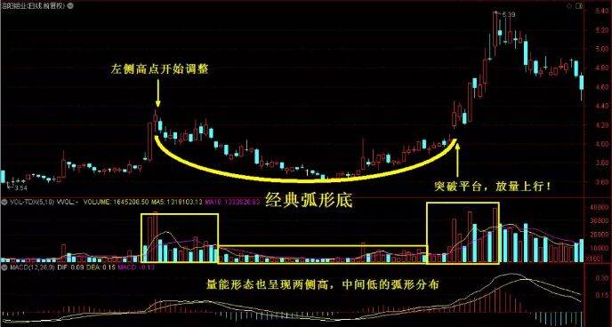 從上圖我們可以看到,這個經典的形態,可以分為圓弧的左半部分與圓弧的右半部分。左半部分是跌的過程,而右半部分是漲的過程,一般是比較流暢,一般是比較曲折。漲的過程,尤其是在面臨突破前,不可避免地會面臨著反復,只要能保持相對強勢,成交量也能出現明顯放大,最終一旦突破上去,漲起來的空間就會更廣闊。