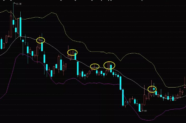 如上圖所示,當中軌方向為下時,說明了K線為下降趨勢,投資者可以選擇不進行操作,或者是以下軌附近為進場點,中軌附近為賣出點,不要再等待K線升至上軌,以免經(jīng)常遇到獲利回吐的情況。