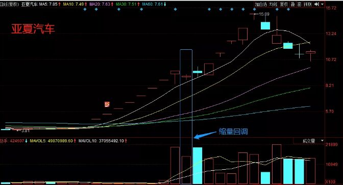 上圖是亞夏汽車的歷史走勢圖,這只股票在當時是重組概念股,公司是中國汽車服務僅有的量價IPO上市企業之一,消息面上,公司擬作價185億置入中公教育的利好消息一出,這只股票便開始了一字飆升,在8連板之后出現縮量回調,其實在縮量回調時介入是最好的時機,縮量回調的次日便收得一個假陰線。