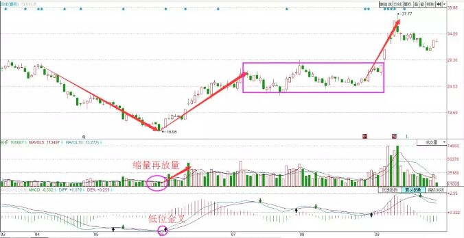 如上圖所示,股價(jià)在下跌一段時(shí)候之后,開始見底,同時(shí)成交量萎縮到地量,然后突然的放大,并出現(xiàn)確定性陽線,同時(shí)mace在地位出現(xiàn)了金叉,之后,這只股票就進(jìn)入到了反彈的階段。我們在來看蘭太實(shí)業(yè)的走勢圖。