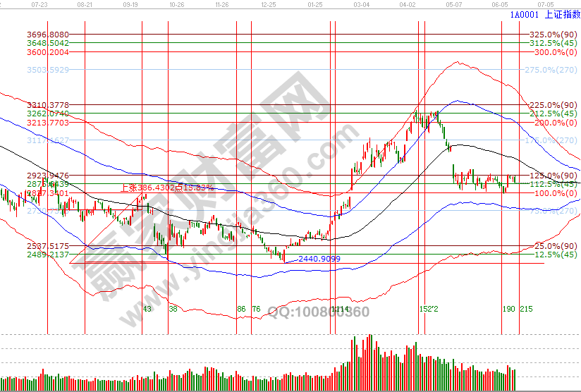 指數(shù)高開(kāi)后一路震蕩走低,收盤正好落在近幾天談到的關(guān)鍵位2880附近,周一17號(hào)是日線時(shí)間窗口,關(guān)注好周末外部因素動(dòng)態(tài),江恩價(jià)格四方形、60分鐘極反通道生命線(2880-2890)區(qū)間能守住則反彈延續(xù),失守則策略調(diào)整為區(qū)間交易法應(yīng)對(duì),下方波段百分比延伸線1倍循環(huán)180度2834點(diǎn)依然是強(qiáng)支撐。最后說(shuō)下,自5月以來(lái)對(duì)市場(chǎng)定性的為反彈,并且給出第一目標(biāo)位2950位置,第二目標(biāo)位是日線黑色生命線,保持平和的心態(tài)應(yīng)對(duì)市場(chǎng)。6月17號(hào)盤中支撐是0度2860點(diǎn)、315度2844點(diǎn),盤中壓力是90度2894、135度2911點(diǎn)。操作策略,指數(shù)處于極反通道弱勢(shì)區(qū)域的反彈走勢(shì),時(shí)間窗口關(guān)注好2880-2890區(qū)間得失,整體持倉(cāng)保持3-5成。