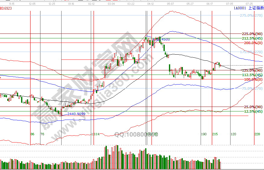 市場走勢同20號分析一致,圍繞日線極反通道黑色生命線上下震蕩,按歷史規律,自下向上的突破生命線需要量能及3天時間確認,指數收盤價一直在生命線上,不足之處是量能出現持續萎縮,27號江恩時間窗口盤中關鍵位2966點,結合周期關系,整體還處于反彈周期內,6月27號盤中壓力是0度2997點、45度3016點,盤中支撐是2966點、2944點。操作策略,指數圍繞極反通道生命線震蕩,延續反彈走勢中,整體持倉保持3-5左右,7月3號時間窗口選擇方向。