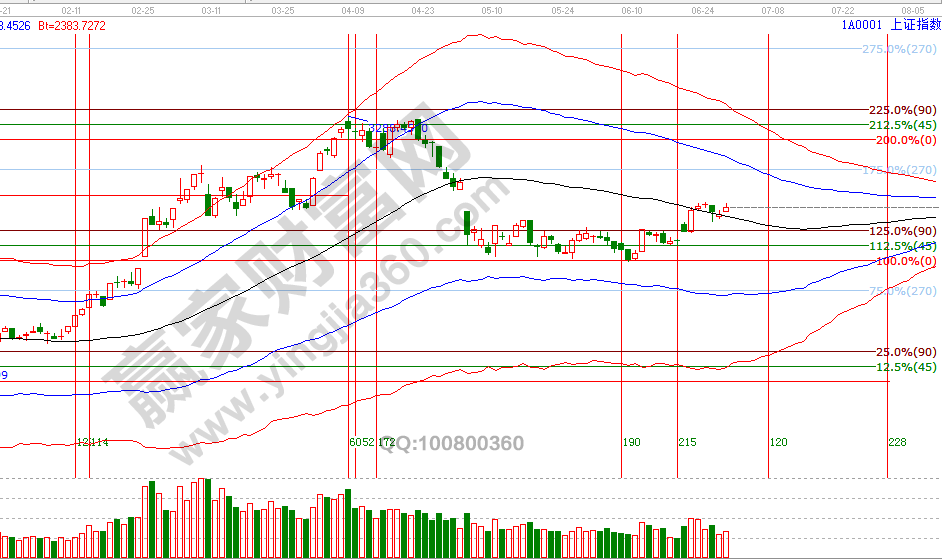 截至今日收盤A股滬深指數時隔39個交易日再度雙雙收復極反通道生命線,先行指數上證50已上攻至藍色上軌線反壓附近,結合各周期走勢大盤將延續反彈動作;空間點位方面,江恩價格四方形、波段百分比線工具顯示,3016-3036區間同極反通道短周期共振,按買在支撐賣在壓力原則,2840附近支撐位買入,第一目標位2950減一次倉,接下來3016-3036區間附近又一次分批獲利參考位;時間方面,7月3號是下一個日線時間窗口,6月27號盤中壓力是45度3016點、90度3036點,盤中支撐是270度2961點、315度2978點。操作策略,指數極反通道生命線附近震蕩,反彈延續中,整體持倉保持3-5左右。