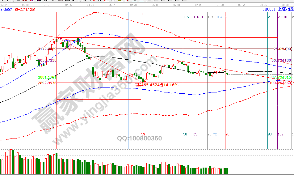 2966是近期一直強調的反彈重要阻力位,30號上攻到2965.6(精準無誤差)后如期受阻回落,再次彰顯江恩對價格點位的精準計算。按照規則壓力位下逢高兌現不開新倉,等待8月1日時間窗口。1號時間窗,指數失收生命線,趨勢再度轉弱。8月2號盤中壓力是135度2911點、180度2928點,盤中支撐是90度2894點、45度2877點。操作策略,指數失守日線生命線,失守60分鐘生命線,穩健者繼續休息,等待新的交易信號出現。整體倉位控制在3成內。
