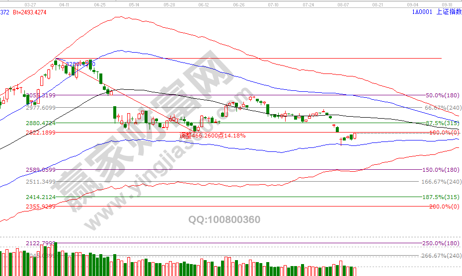 指數自6號觸及極反通道藍色下軌線2744點獲得支撐后展開反抽已有5個交易日,按時價等倍關系測算空間運行不足一半,從這一點說明市場反抽力量之弱。短周期15分鐘藍色上軌線是2823點(缺口位置是2822點),指數越向上運行遇到反壓級別越大,日線波段百分比延伸線180度是2834點,這也是6號測算的2744點、2834點兩個關鍵位,反抽時間還沒有結束,震蕩不改反抽目標位。8月13號盤中壓力是270度2829點,盤中支撐是180度2800點、2791點,日線時間窗口是16號。操作策略,指數生命線下弱勢區運行,激進者3成倉交易,穩健者空倉休息。