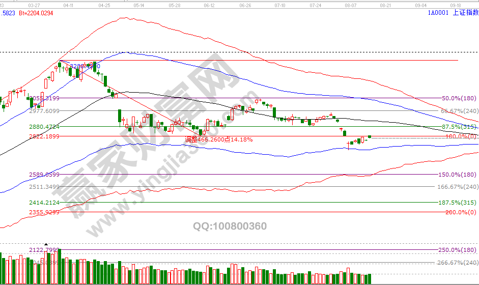 6號(hào)開盤前贏家江恩系統(tǒng)VIP學(xué)員區(qū)發(fā)周期共振圖,指數(shù)觸及極反通道藍(lán)色下軌線2744點(diǎn)后激進(jìn)者開倉(cāng),并于當(dāng)天收盤分析中給出反抽目標(biāo)位是波段百分比延伸線180度2834附近,今日指數(shù)高開上攻正好到13號(hào)分析的反壓位2829點(diǎn)回落,學(xué)員區(qū)繼12號(hào)提示分批第一次減倉(cāng)獲利后,今日早盤觸及15分鐘藍(lán)色上軌線再度做圖分析達(dá)到獲利了結(jié)條件。隨著時(shí)間窗口、目標(biāo)價(jià)臨近,代表價(jià)格將再會(huì)進(jìn)入一次較大波動(dòng)期,另外早盤談到科技股短期高點(diǎn)形成,激進(jìn)者剩余最后一批倉(cāng)可以以百分比延伸線120度2791為參考線。8月15號(hào)盤中壓力是225度2815點(diǎn)、270度2829點(diǎn),盤中支撐是135度2786點(diǎn)、90度2772點(diǎn),本周五日線時(shí)間窗口。操作策略,指數(shù)生命線下弱勢(shì)區(qū)運(yùn)行,激進(jìn)者3成倉(cāng)交易,穩(wěn)健者空倉(cāng)休息。