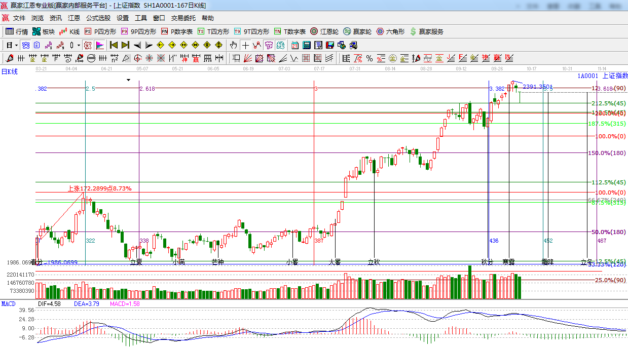 ☆依據贏家江恩系統黃金時間周期線提示:10月9日以及寒露時間節點之后,指數重心下移,短期可能將要調整幾天了,下一時間窗口10月22日。