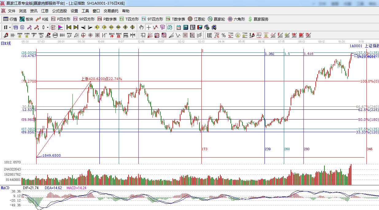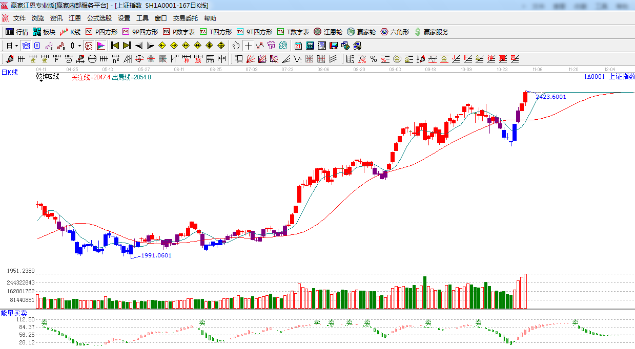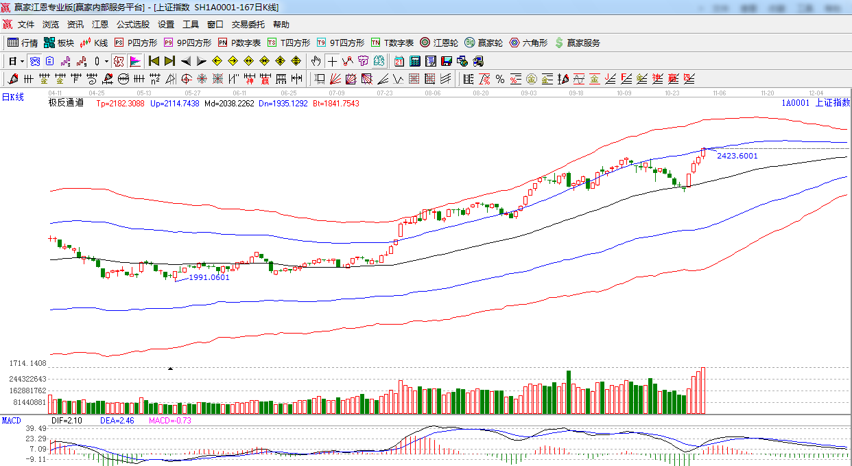 ★依據(jù)贏家江恩系統(tǒng)極反通道提示:指數(shù)繼續(xù)放量上行,突破藍色外軌2410點,留意后期量能,如不能支持,此位置將仍有反復(fù)。